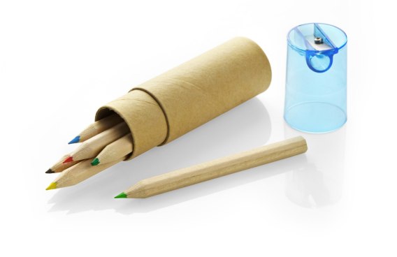 Drewniane kredki w sześciu kolorach. Całość zapakowana w tekturową tubę, która zamykana jest plastikowym zamknięciem zawierającym temperówkę. Logo nadrukujemy na tubie.