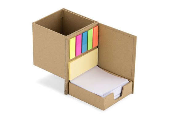 Przybornik na biurko KOS to funkcjonalny gadżet reklamowy wykonany z papieru kraftowego. W wersji złożonej pełni rolę eleganckiego stojaka na przybory biurowe, co pozwala na zachowanie porządku na biurku. Po rozłożeniu odkrywa zestaw karteczek samoprzylepnych, w tym pięć foliowych znaczników w różnych kolorach (po 25 sztuk każdy), średnie żółte karteczki samoprzylepne (25 sztuk) oraz około 200 luźnych kartek o wymiarach 72x72 mm, umieszczonych w dedykowanym miejscu. Przybornik KOS wyposażony jest także w miejsce na notatki mazakiem ścieralnym, co zwiększa jego funkcjonalność. Dzięki możliwości znakowania, można umieścić na nim logo lub inny tekst promocyjny, co sprawia, że jest doskonałym narzędziem do budowania wizerunku marki.