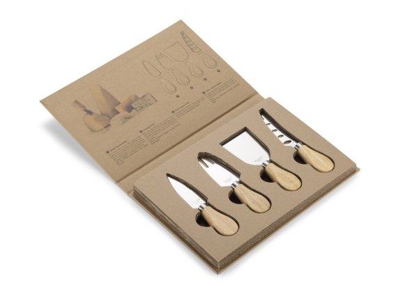 Zestaw 4 noży do sera zapakowany w klasyczne, porządnie wykonane papierowe pudełko. Wewnątrz opakowania umieszczona jest infografika wraz ze zdjęciem i opisem do czego dany nóż jest przeznaczony. Ten zestaw to doskonały pomysł na prezent. Noże wykonane ze stali nierdzewnej.