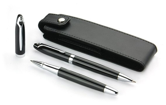 Elegancki zestaw piśmienniczy składający się z długopisu i pióra kulkowego. Zapakowany jest w etui wykonane z materiału skóropodobnego (PU). Grawer logo możemy wykonać na artykułach piśmienniczych.