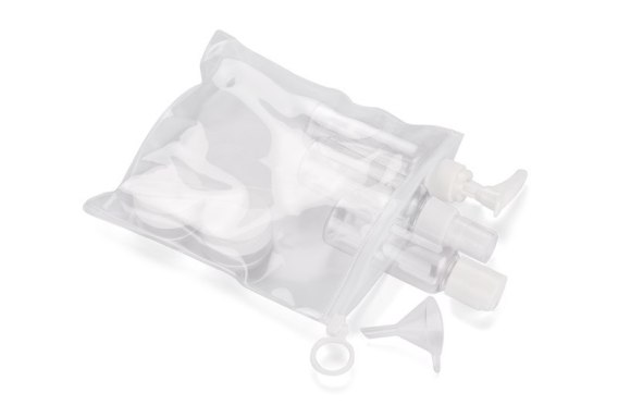 Praktyczny zestaw pojemników podróżnych AIRO umożliwia wygodne i higieniczne przechowywanie kosmetyków podczas podróży. W jego skład wchodzą: buteleczka z atomizerem, buteleczka z pompką, buteleczka z zamknięciem oraz dwa słoiczki. Dołączony lejek ułatwia precyzyjne przelewanie płynów, a łyżeczka jest idealna do przekładania kosmetyków o kremowej konsystencji. Przezroczyste pojemniki z białymi nakrętkami ułatwiają identyfikację zawartości. Zestaw zawiera także etui, z jednej strony przezroczyste, a z drugiej mleczne, zamykane strunowo. Kompaktowe rozmiary pojemników spełniają wymogi linii lotniczych.