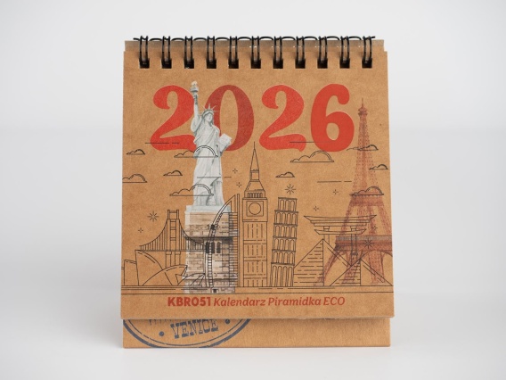 Kalendarz biurkowy piramidka w wersji eko. Wykonany jest on na podłożu Krafliner 300 g. Jest to brązowy, ekologiczny papier posiadający certyfikat FSC. Kalendarz składa się z 13 kart, co pozwala na personalizowanie każdego miesiąca w dowolny sposób. Dodatkowo, 13 karta, to miejsce na okładkę Kalendarza.