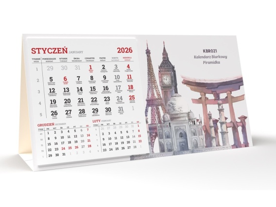 Kalendarz piramidka z klejonym kalendarium, to doskonały gadżet na biurko. Kalendarz biurkowy posiada kalendarium w układzie trzymiesięcznym. Kalendarz umożliwia druk dowolnej grafiki z obu stron piramidki. Kalendarze dostarczane są na płasko, do samodzielnego złożenia.